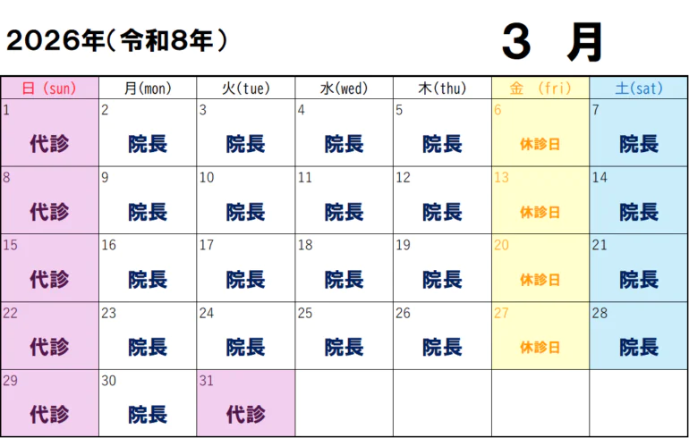 ※代診医師の担当日は目の状態によっては対応出来ない検査や処置がありますので事前に電話連絡をお願い致します。